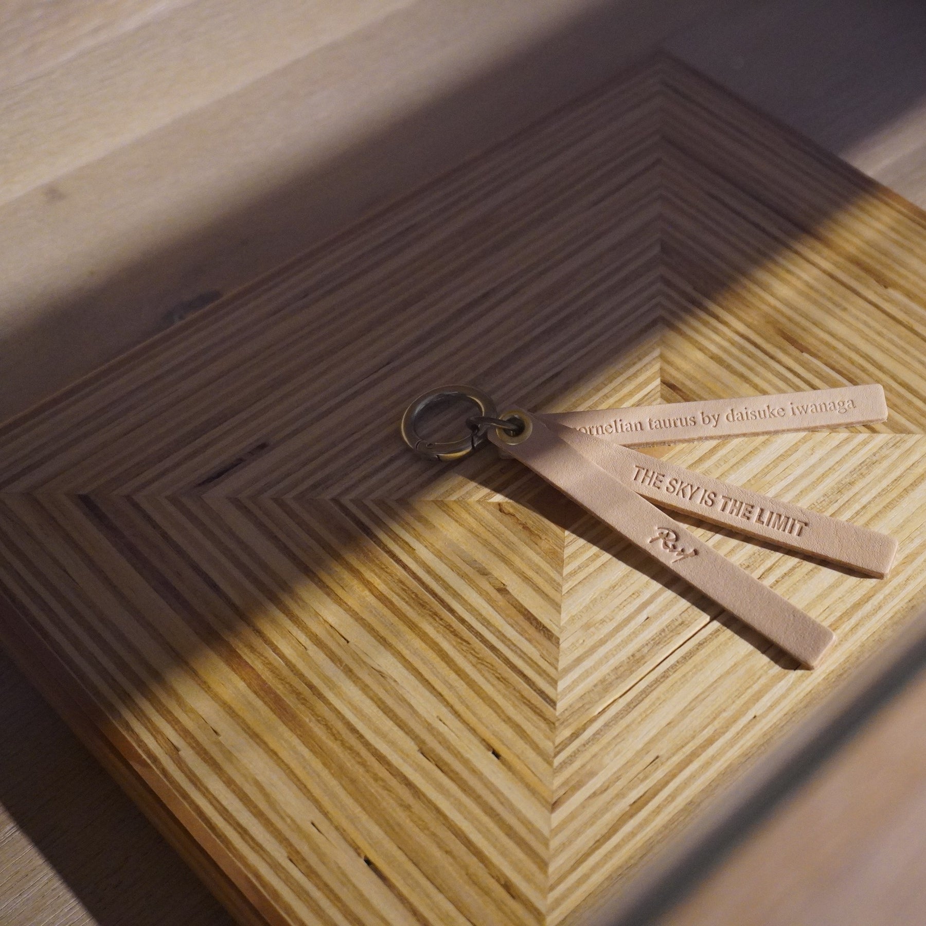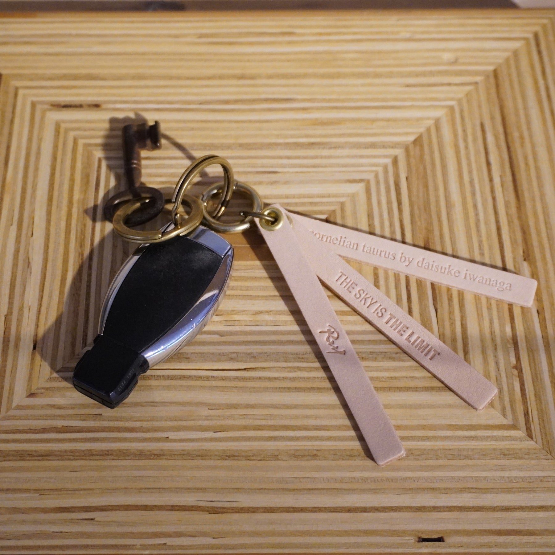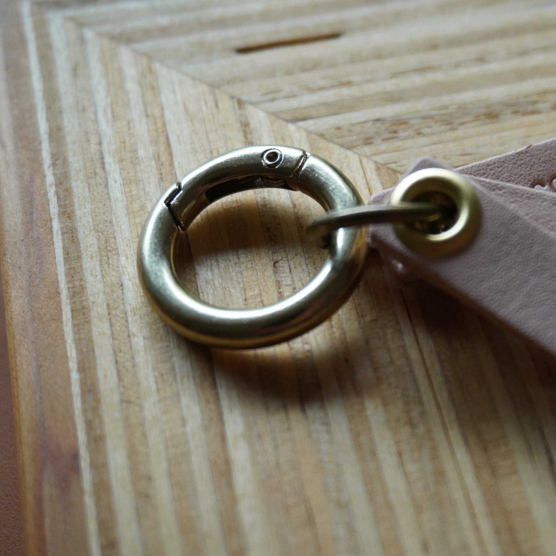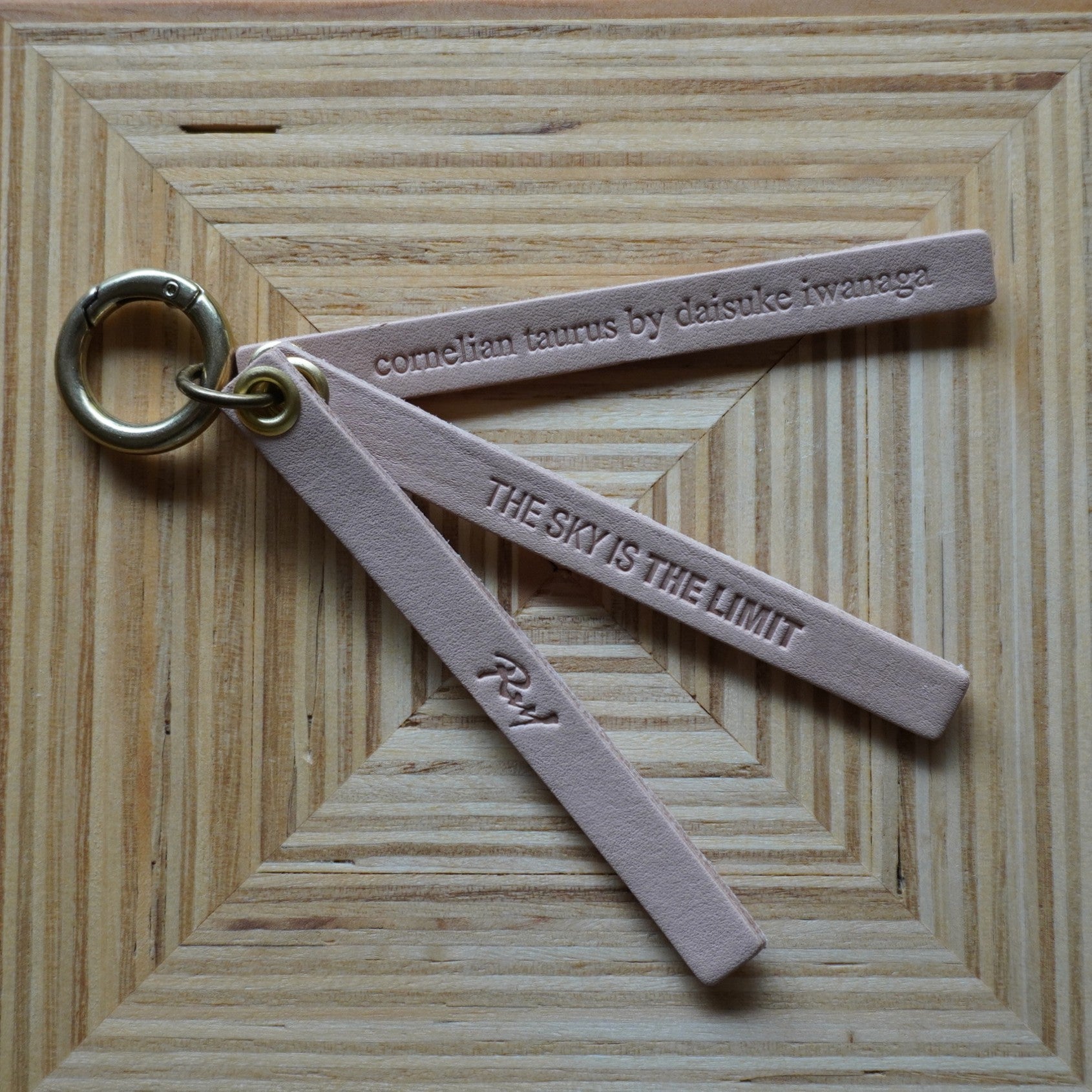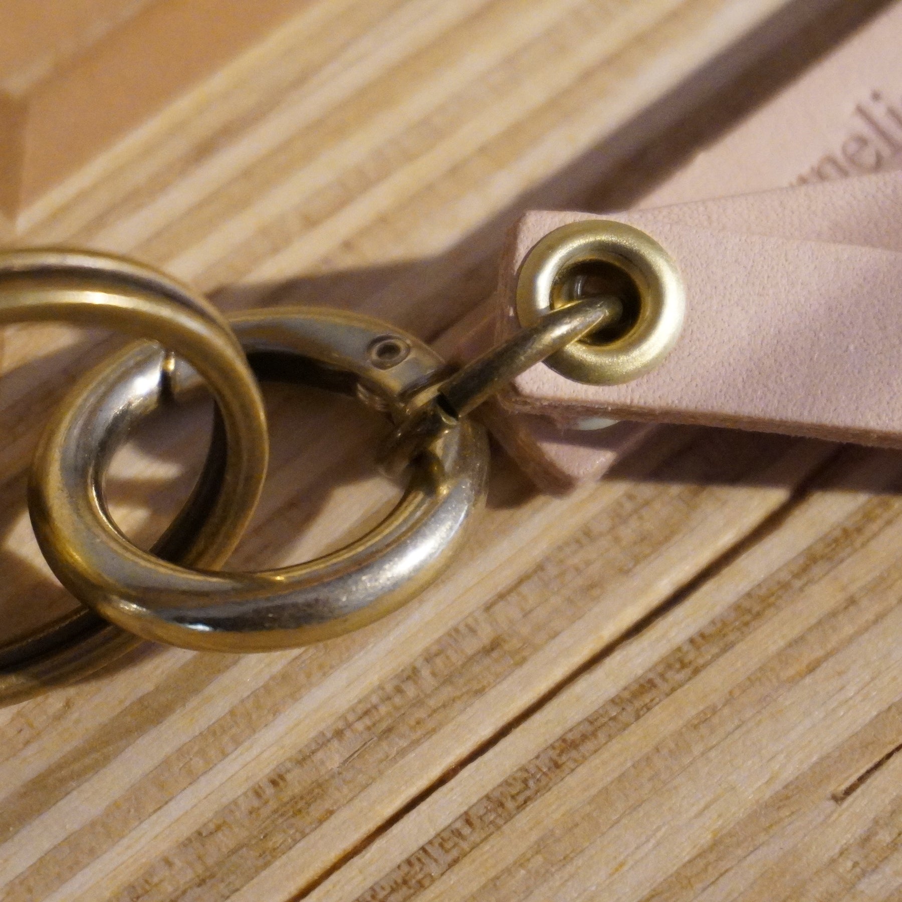 真鍮製の円形カラビナにナチュラルカラーのコーネリアンタウラスオリジナル3連レザータグをチャームとして装着。