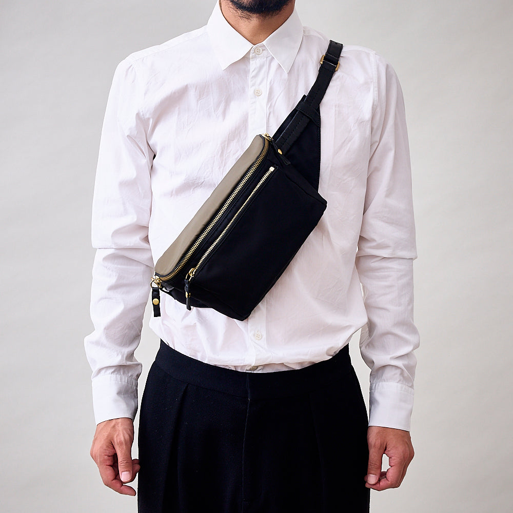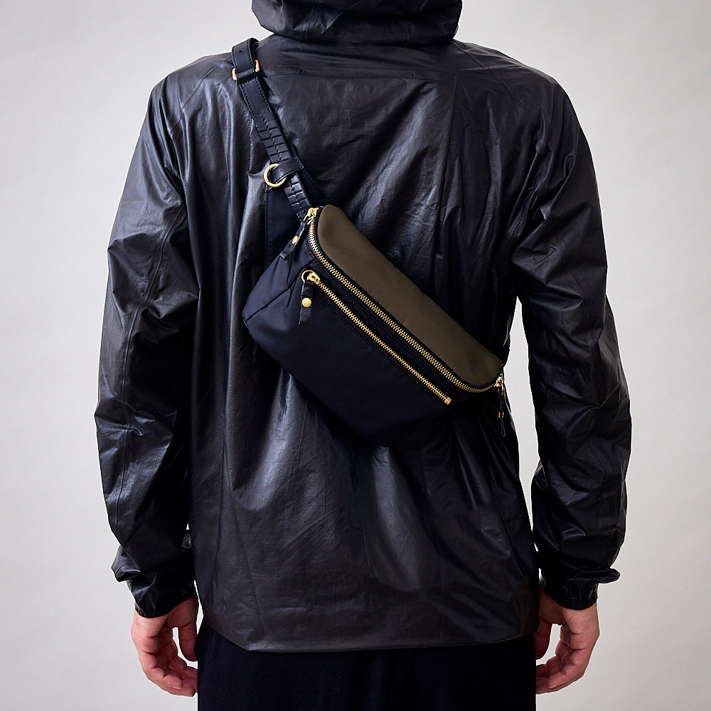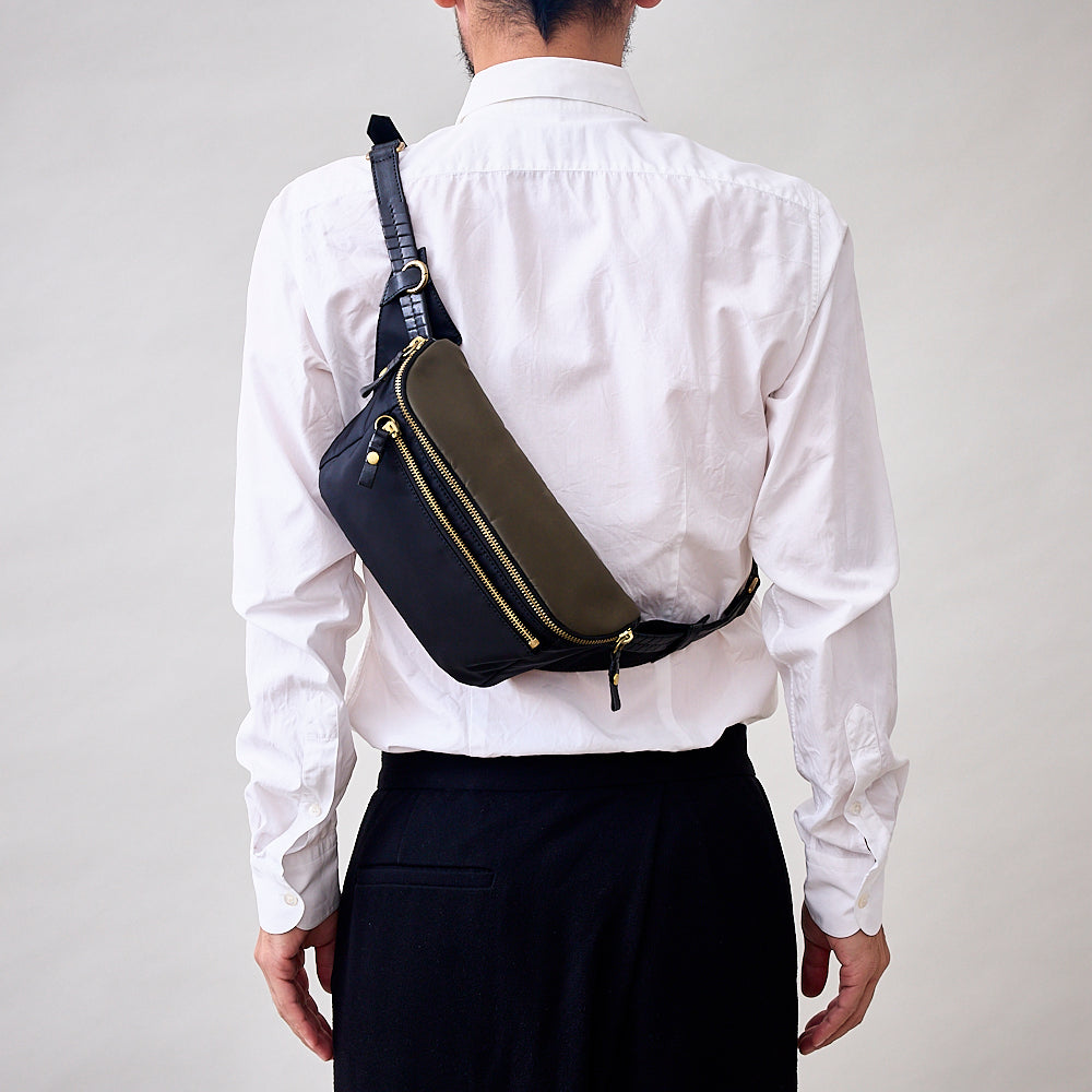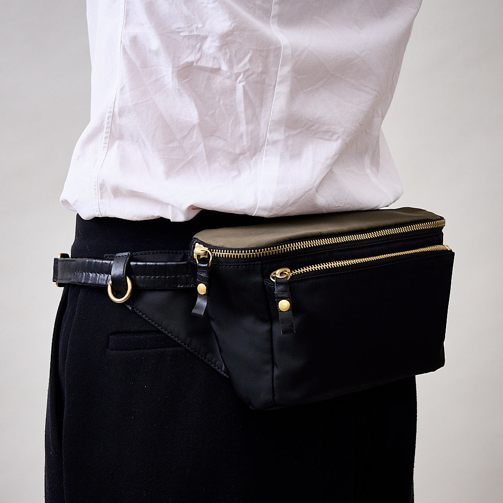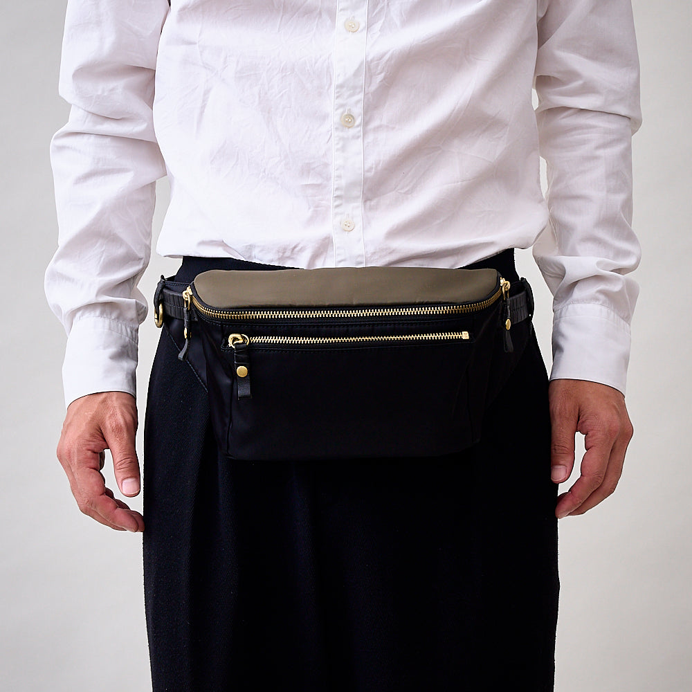 *2tone*Bk features a bi-color design with black and khaki for the nylon part on the front and back. The waist belt is made of black leather.