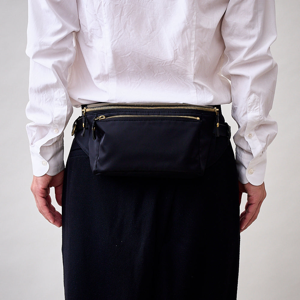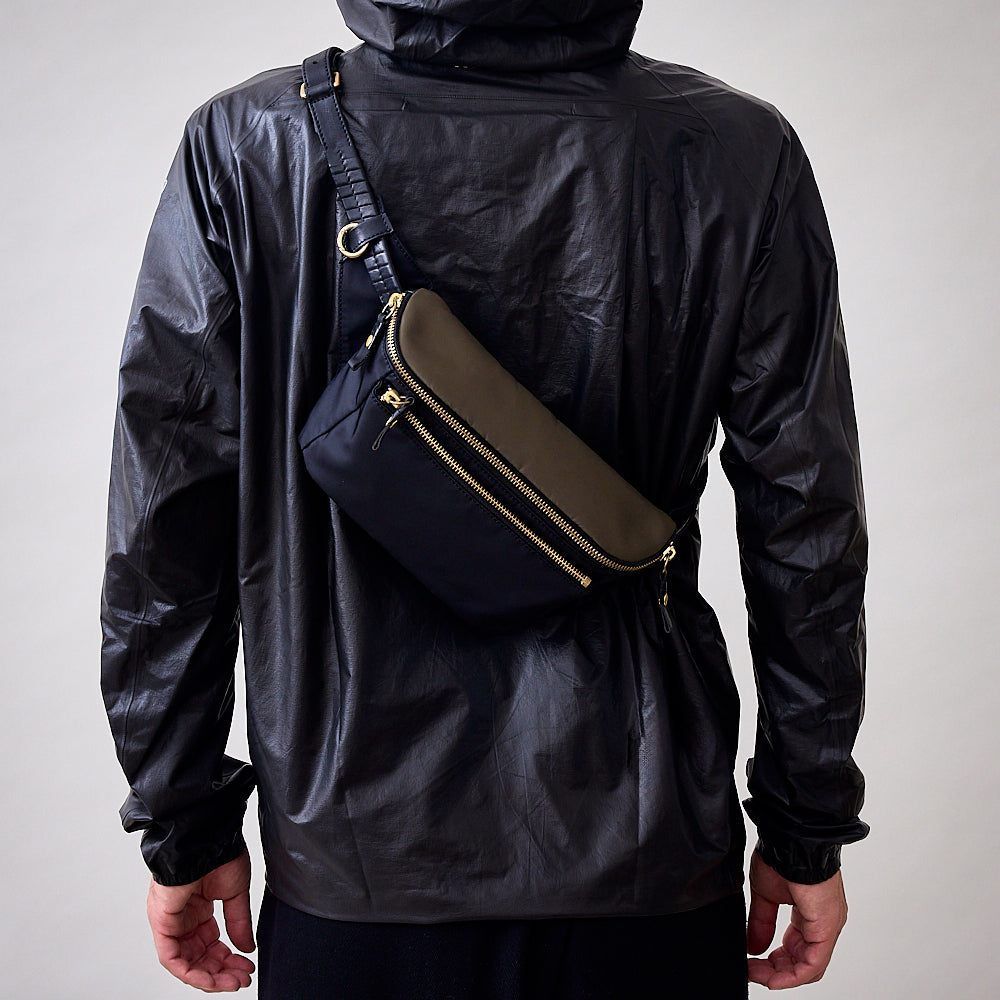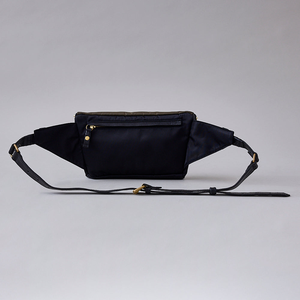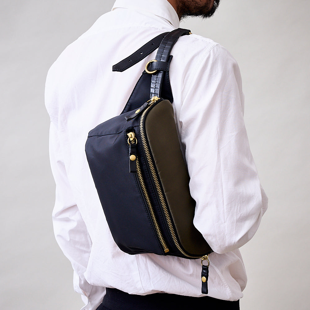 *2tone*Bk features a bi-color design with black and khaki for the nylon part on the front and back. The waist belt is made of black leather.
