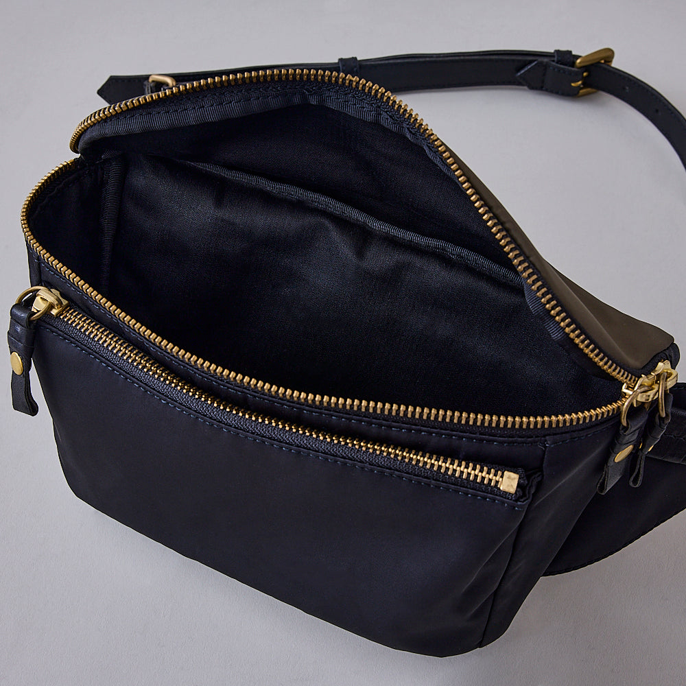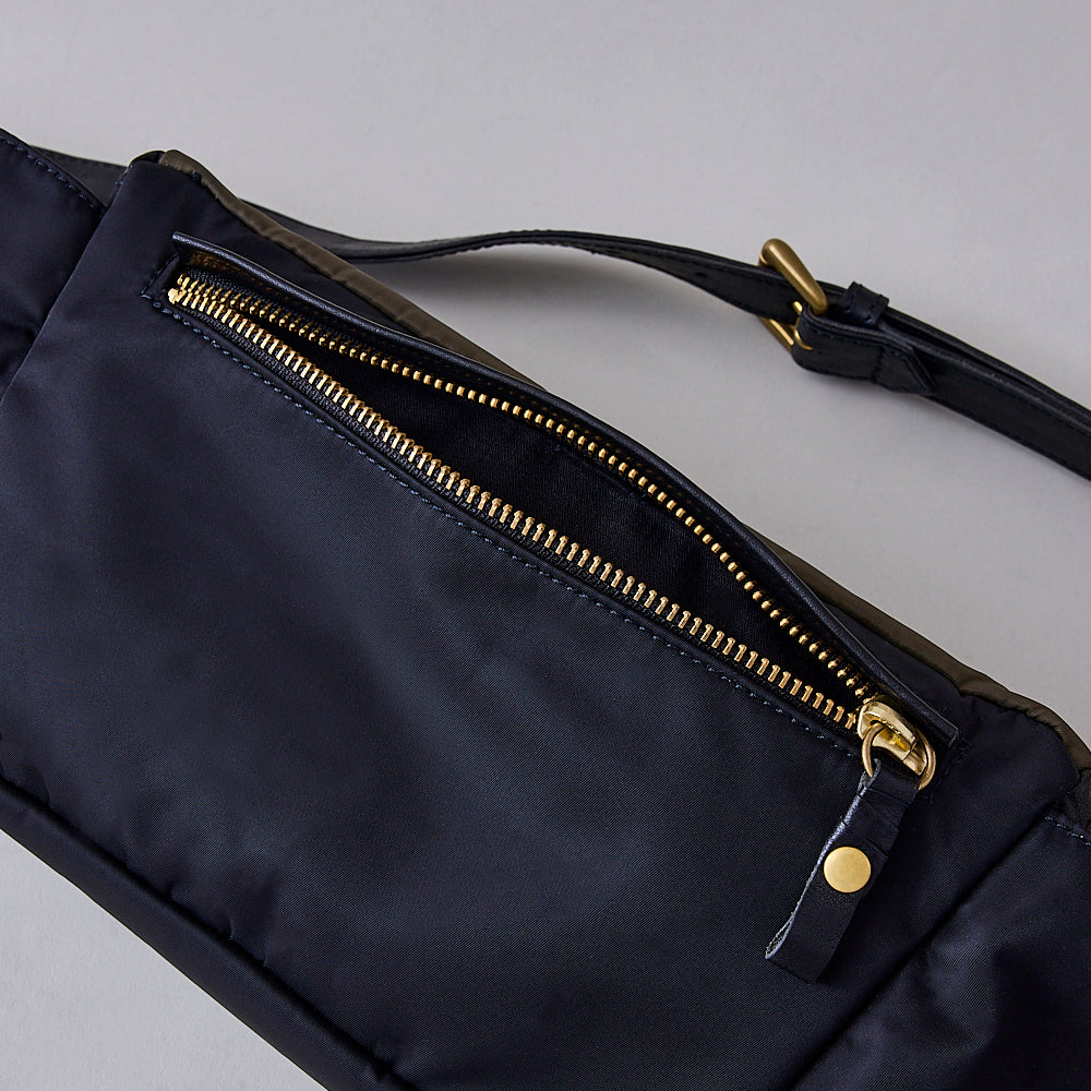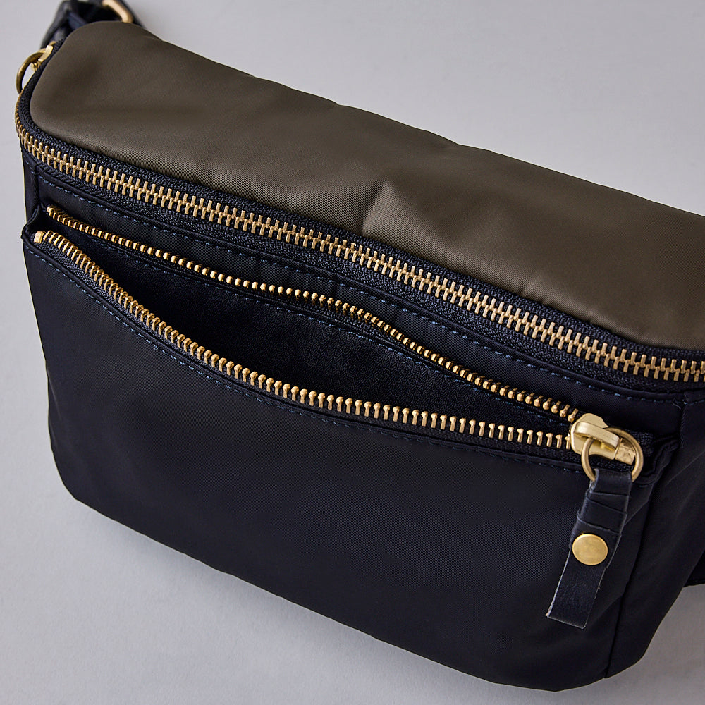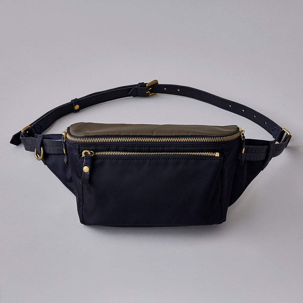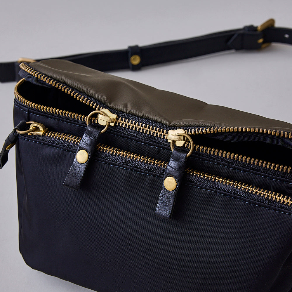 *2tone*Bk features a bi-color design with black and khaki for the nylon part on the front and back. The waist belt is made of black leather.